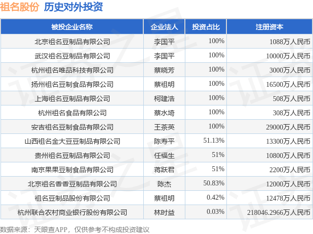 本站消息,根据天眼查APP显示,祖名股份(003030)新增一起对外投资事件,被投资公司为祖名豆制品股份有限公司,法定代表人蔡祖明,投资占比为0.42%。该公司从事农副食品加工业,注册资本为12478万人民币。目前宏琳优配宏琳优配,祖名股份共存在对外投资13项,详见下表: