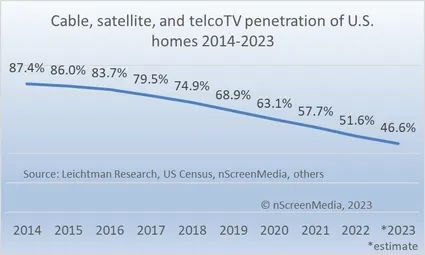 文章称,在2010年代,当YouTube经历爆炸性增长时,有线电视捆绑套餐达到了顶峰,然后开始衰落。如今,传统电视的渗透率已经跌至40%左右。