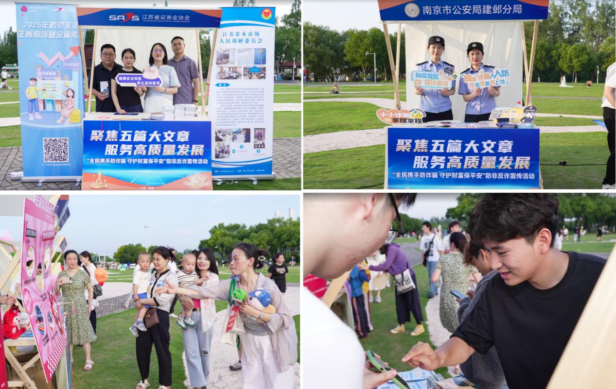 江苏省证券业协会、南京市公安局建邺分局、华林证券投教基地等单位布置了投教展台,通过发放精美的投教纪念品及一系列精彩的互动游戏,将防非反诈知识潜移默化地传播给投资者。