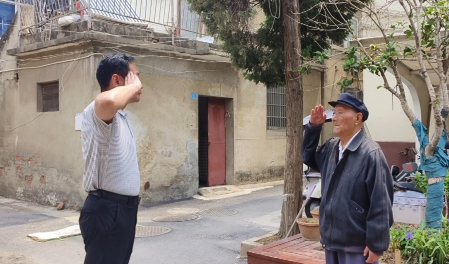 曾为军人的记者向老兵敬礼,老兵回礼。