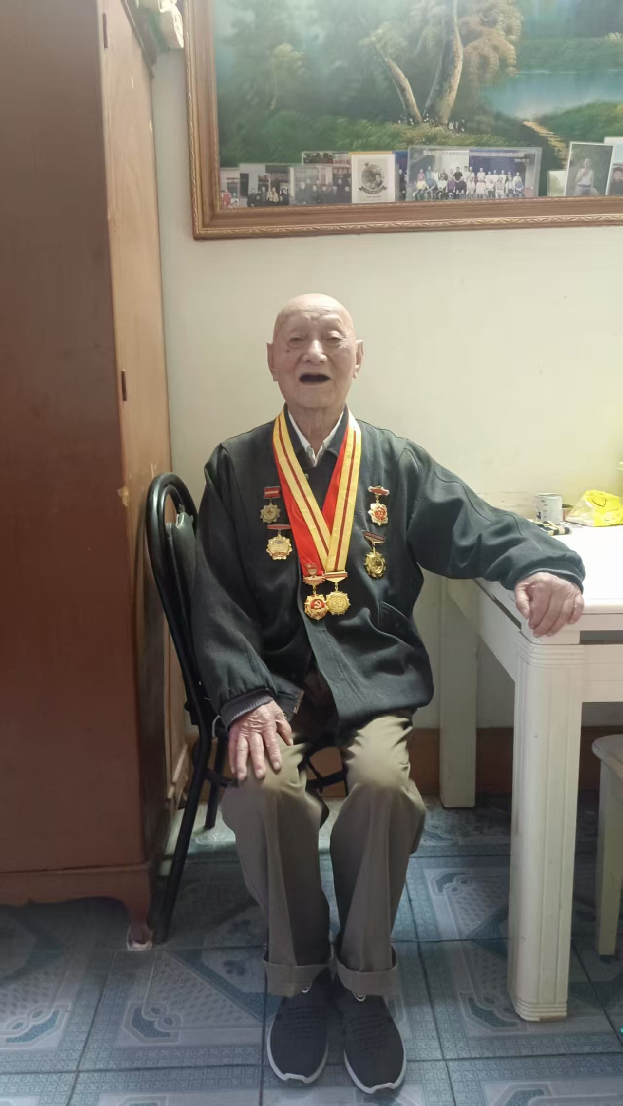 在蚌埠市怀远县城南大街青龙桥的百货公司宿舍,一栋三层楼的二楼东侧,郑志龙与照顾他的小女儿郑红艳一家生活在此。得知记者要来采访,已99岁高龄的他早早在门口等候,还特意戴上帽子整理形象。尽管头发稀疏,牙齿完全脱落导致口齿有些不清,但交谈时言语间依旧中气十足。