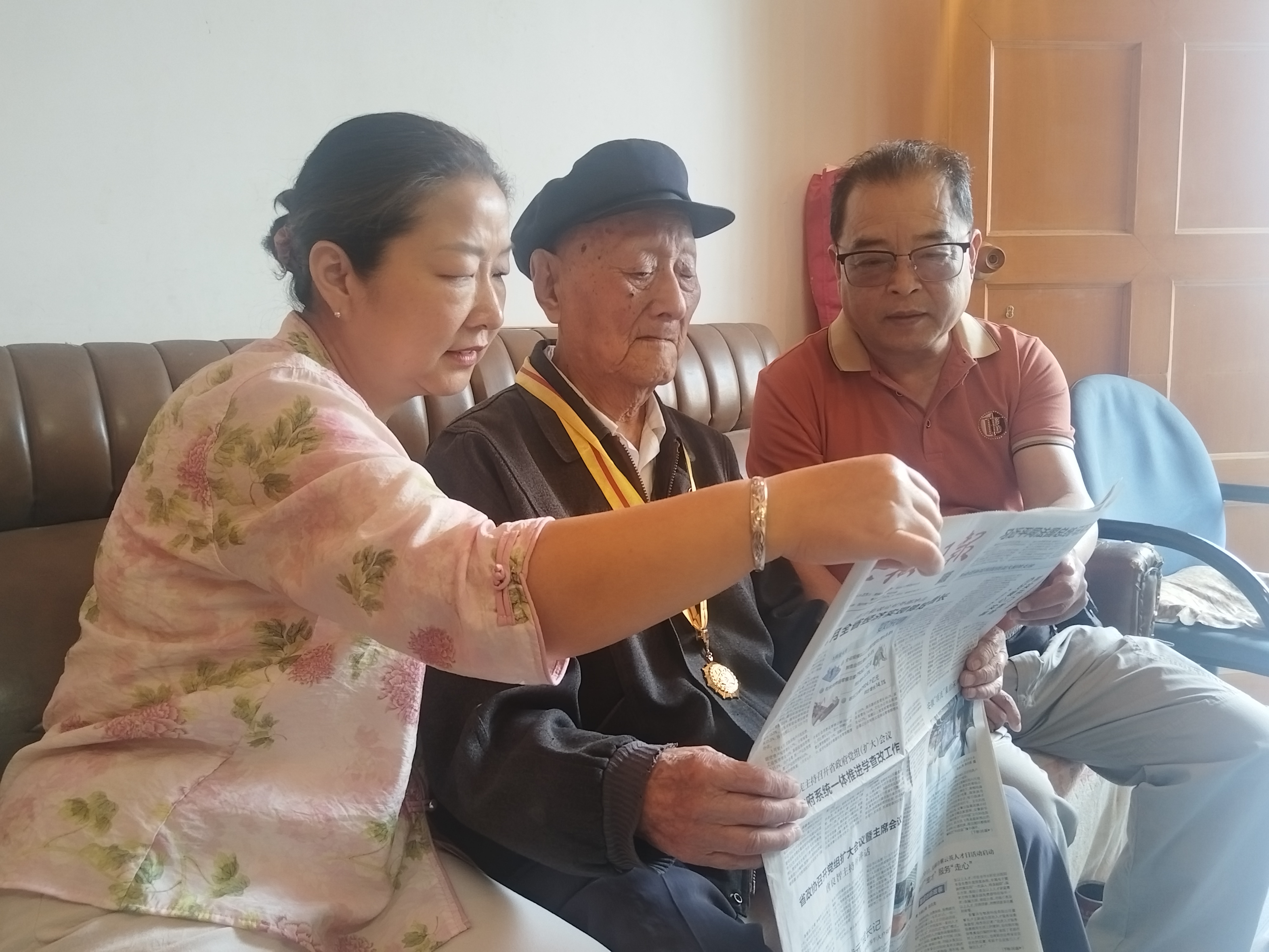 郑志龙老人同女儿女婿阅读报纸