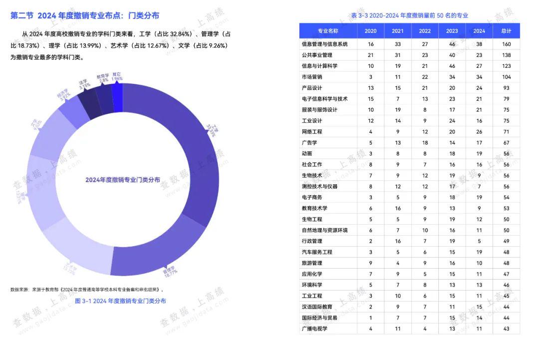 高绩数据发布的《中国高校本科专业新增与撤销分析报告》显示,2024年度撤销的学科门类中,工学占比32.84%,管理学占比18.73%,理学、艺术学、文学分别占比13.99%、12.67和9.26%。